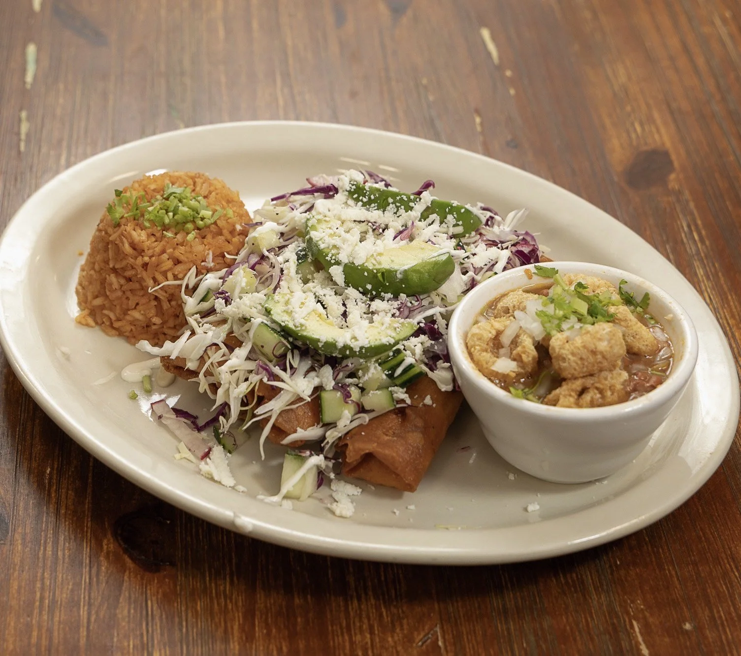 3 FLAUTAS WITH ADOBO SHRIMP AND CHEESE, COVERED WITH LETTUCE, QUESO FRESCO, CREMA MEXICANA, Y AVOCADO. SERVED WITH MEXICAN RICE, AND BORRACHO BEANS.