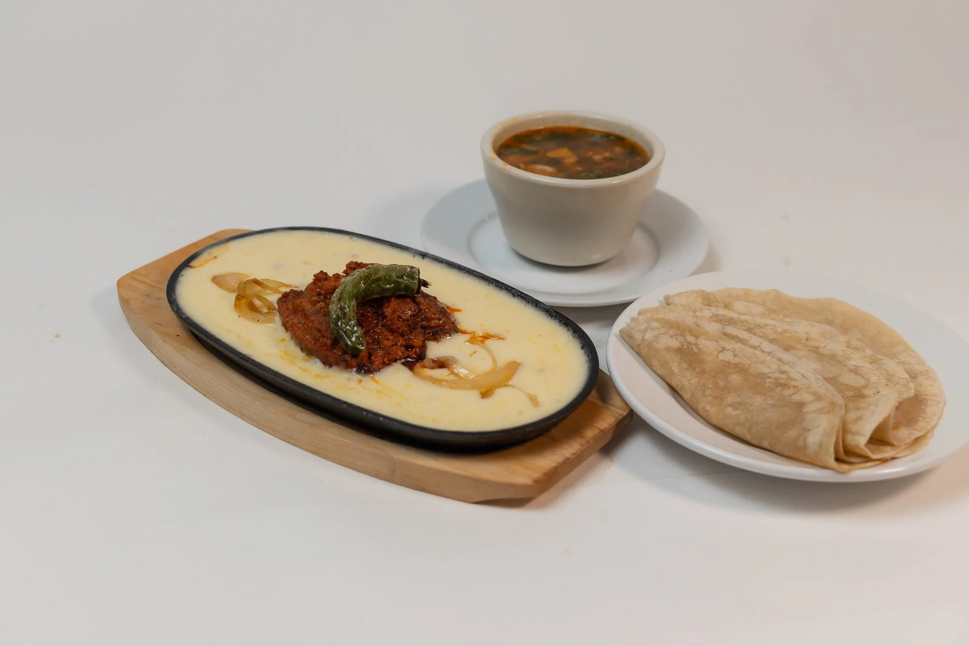 WITH ASADERO CHEESE,FAJITA ONIONS, AND SMOKED CHORIZO. SERVED WITH CHARRO BEANS AND FLOUR OR CORN TORTILLAS.SERVED WITH SALSA MACHO